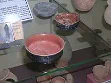 This is a selection of handmade pottery in different ware styles. These styles are called: Base Ring, White Slip, Monochrome, White Shaved, White Painted, Bucchero. Of these different kinds, Monochrome, White Slip, and Base Ring were most used. It appears as though this type of pottery was found to be decorative in nature rather than useful.[5] "Bilbil juglets" are an example of Base Ring ware, which are pottery and have long slim necks.[6][7] Archaeologists speculate that bilbil juglets may have been used in the trade of opium, due to traces of opiates found in some of the styles of the jugs, as well as the shape of the vessel resembling an upturned Papaver somniferum.[8]