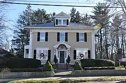 The Lewis House is a historic house at 276 Woburn Street in Reading, Massachusetts. The 2+1⁄2-story wood-frame house was built in the late 1870s by John Lewis, a successful shoe dealer. The house is three bays wide, with a hipped roof with a single gable dormer. The roof has extended eaves with false rafter ends that are actually lengthened modillion blocks; these features give the house a Colonial Revival feel. The corner boards are pilastered, and the front entry is flanked by half-length sidelight windows and topped by a pedimented lintel, above which is a round fanlight window.[2]