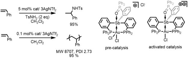 Lewis acidic antimony compounds can act as Z-type ligands. Owing to the strong σ-accepting ability of dicationic Sb ligand, a gold-antimony complex can catalyze styrene polymerization and hydroamination after being activated by AgNTf2.[21]