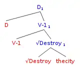Morris Halle and Alec Marantz introduced the notion of distributed morphology in 1993.[21] This theory views the syntactic structure of words as a result of morphology and semantics, instead of the morpho-semantic interface being predicted by the syntax. Essentially, the idea that under the Extended Projection Principle there is a local boundary under which a special meaning occurs. This meaning can only occur if a head-projecting morpheme is present within the local domain of the syntactic structure.[22] The following is an example of the tree structure proposed by distributed morphology for the sentence "John's destroying the city". Destroy is the root, V-1 represents verbalization, and D represents nominalization.[22]