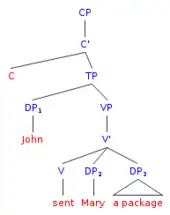 Richard Kayne proposed the idea of unambiguous paths as an alternative to c-commanding relationships, which is the type of structure seen in examples (8). The idea of unambiguous paths stated that an antecedent and an anaphor should be connected via an unambiguous path. This means that the line connecting an antecedent and an anaphor cannot be broken by another argument.[31] When applied to ditransitive verbs, this hypothesis introduces the structure in diagram (8a). In this tree structure it can be seen that the same path can be traced from either DP to the verb. Tree diagram (7b) illustrates this structure with an example from English. This analysis was a step toward binary branching trees, which was a theoretical change that was furthered by Larson's VP-shell analysis.[32]