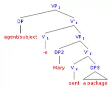 The subunits of Verb Phrases led to the Argument Structure Hypothesis and Verb Phrase Hypothesis, both outlined below.[17] The recursion found under the "umbrella" Verb Phrase, the VP Shell, accommodated binary-branching theory; another critical topic during the 1990s.[18] Current theory recognizes the predicate in Specifier position of a tree in inchoative/anticausative verbs (intransitive), or causative verbs (transitive) is what selects the theta role conjoined with a particular verb.[12]