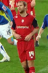 He received interest from Barnsley in September 2005, though he remained put at Colchester.[19] He made another 40 appearances in 2005–06, and found himself on the scoresheet in games at Milton Keynes Dons and AFC Bournemouth.[20][21] He helped the club to win promotion into the Championship as League One runners-up.[22] During the campaign he picked up eight bookings.