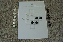 Liberian Queah is a two-player abstract strategy game from Liberia. It is specifically from the Queah tribe. The game is played on a slanted or diagonal square board with only 13 spaces. Pieces move "orthogonally" along these slanted or diagonal square boards. Another unique feature is that each player must have four (and only four) pieces on the board. Each player's captured piece is resupplied at the beginning of their next turn with a piece from their reserve (unless of course the player has no more pieces to resupply with).