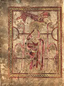 The Lichfield Gospels (also known as the St Chad Gospels, the Book of Chad, the Llandeilo Gospels, the St Teilo Gospels and variations of these) is an 8th-century Insular Gospel Book housed in Lichfield Cathedral. There are 236 surviving pages, eight of which are illuminated. Another four contain framed text. The pages measure 30.8 cm by 23.5 cm. The manuscript is also important because it includes, as marginalia, some of the earliest known examples of written Old Welsh, dating to the early part of the 8th century.[1] The art historian Peter Lord dates the book at 730, placing it chronologically before the Book of Kells but after the Lindisfarne Gospels.[2]