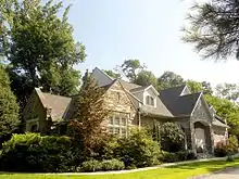 Design of "Lindenshade" (1873) is attributed to Frank Furness.[2]: 175, cat. 39A Some of the house's later additions have been documented to Furness; others have not be documented, but are attributed to Furness.[2]: 344B, cat. 39 "'Lindenshade' began as a modest clapboard summer cottage overlaid with a stick-style frame in the manner of Richard Morris Hunt, but enlivened by the Furness wit—chimneys rose in front of dormers and tiny windows vied with oversized sashes in adjacent openings."[2]: 175 Some of its architectural features – the stickwork,[5] the bracketed dormers, the hooded jerkin-head gable – had been used by Furness a year earlier for "Fairlawn" (c. 1872), Fairman Rogers's summer cottage in Newport, Rhode Island.[2]: 171, cat. 34 They would appear in more exaggerated form on later houses, notably the Emlen Physick house (1879), in Cape May, New Jersey.[6]