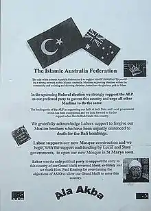 The pamphlet claimed to be from "The Islamic Australia Federation", a non-existent organisation. It strongly urged support for the Labor party in the upcoming federal election and went on to praise the ALP on a number of divisive issues, including:[2]