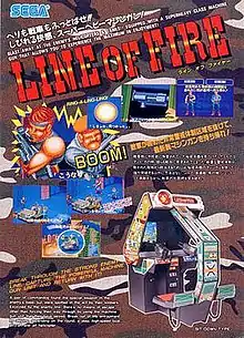 Line of Fire is a first-person light gun shooter game developed by Sega and released for arcades in 1989. It was released with two arcade cabinet versions, a standard upright and a sit-down cockpit, both featuring two positional guns. The cockpit design allows the player(s) to sit down while playing the game, while having two-handed machine guns,[4] controlled by a potentiometer-controlled gun alignment software system.[5] The game follows a two-man commando unit as they try to escape from a terrorist facility after seizing a prototype weapon.