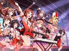 Poppin'Party (PoPiPa for short), the first band in the BanG Dream! franchise, serves as the protagonists of the anime series. Formed by Kasumi Toyama, the band consists of five high school friends who support her in her journey to rediscover the "Star Beat". Although their raw skill is not the best, they make up for this with their strong energy and innate connection between each other. Their name references the "popping" theme of their band and music; before performances, they huddle and recite the chant, "PoPiPa, PiPoPa, PoPiPaPaPiPoPa!".[14][15]