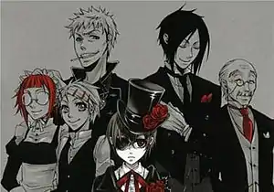 The manga and anime series Black Butler features an extensive cast of characters created by Yana Toboso. The series takes place in England during the reign of Queen Victoria. It follows Sebastian Michaelis, a demonic butler obliged to serve ten-year-old (later thirteen-year-old) Earl Ciel Phantomhive due to a contract he made with Ciel. Ciel binds Sebastian to his will to exact his revenge upon the people that humiliated and tortured him and killed his family in order to make them suffer the same pain.
