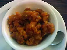| Chana masala | ![]() | Chickpeas of the Chana type in tomato based sauce. | Vegetarian |