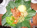 Tumpeng nasi kuning, the cone shaped yellow rice surrounded by assorted Indonesian dishes, usually served for celebrations and ceremonies