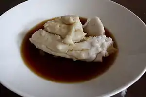 | Dangke | South Sulawesi | A traditional cheese that made from buffalo or cow milk. This dish is processed by boiling fresh milk with sliced papaya leaves, stems, or unripe papaya fruits. Dangke is typically soaked in a brine solution overnight before being wrapped with banana leaves for masking the bitter taste caused by the addition of papaya leaves. | |
