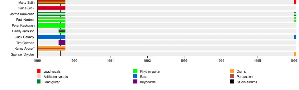 In 1989, Jefferson Airplane reformed for an album and tour, with Slick, Balin, Kaukonen, Kantner and Casady joined by session/touring musicians. A second reformation followed at the band's Rock and Roll Hall of Fame induction in 1996.