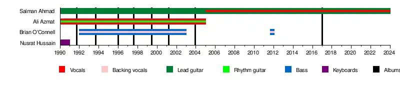 In 2003, after the release of seventh studio album Dewaar in 2003, bassist Brian O'Connell left the band and returned to his native land United States. Since his departure, Pakistani musician Mekaal Hasan and the band's producer John Alec have been playing bass guitar for live shows in place. Dewaar was the album to have the featured the trio together. In 2005, vocalist Ali Azmat left the band to pursue his career as a solo artist and has released two studio albums to date. Salman Ahmad also went on to pursue his solo career and released his debut solo album, Infiniti in July 2005.[3]