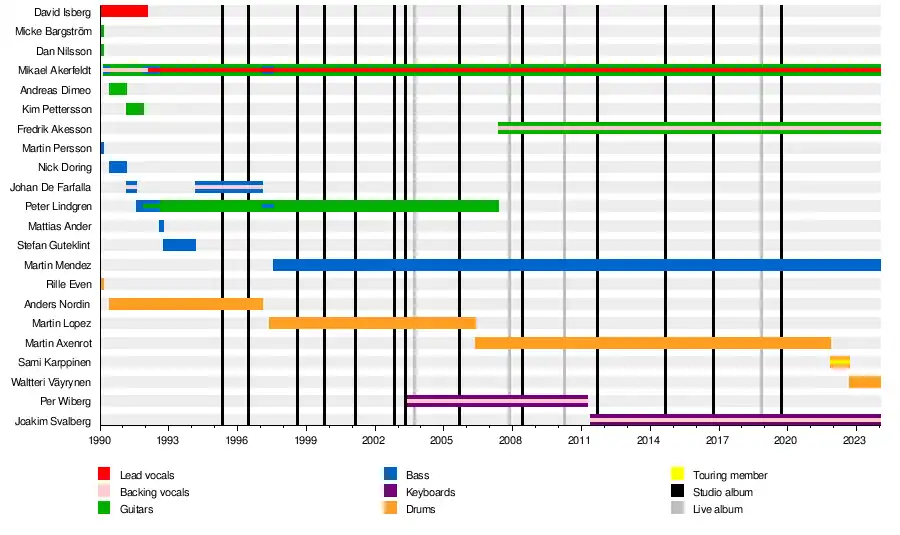 The lineup of Åkerfeldt, Åkesson, Méndez, Axenrot and Svalberg remained stable for ten years, before it was announced in November 2021 that Axenrot had left the band due to a "conflict of interests". He was replaced for upcoming tour dates by Therion's Sami Karppinen.[19]