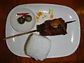 Mechado Meat dish Name derived from mitsa meaning "wick" which is what the pork fat inserted into a slab of beef looks like before the larded beef is cooked, sliced, and served in the seasoned tomato sauce it is cooked in.