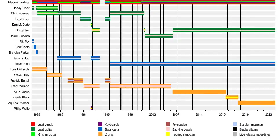 Lawless is the last remaining original member of the group, which currently also features lead guitarist Doug Blair (in 1992 and 2001, and since 2006), bassist Mike Duda (since 1995) and drummer Aquiles Priester (since 2017).