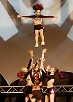 The flyer is the athlete who is lifted into the air during a stunt and is on top of the stunt or pyramid. Since many of the body positions a flyer can perform require a high level of flexibility, this is a desired trait for the role. Flyers are also typically the shortest and smallest members of a team, but any member can act as a flyer depending on their abilities and the needs of the team. The flyer's main job is to squeeze their muscles together in order for their bases to be able to perform stunts from below them. The flyer can make or break the stunt since they have control over what is put up in the air.[2][3]