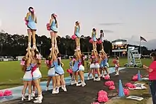 Rules for collegiate squads in the United States are usually similar across the board and are created by USA Cheer.[11] The standard to which these rules and regulations are enforced depends on whether each university classifies cheerleading as an official school sport, a club, or some other type of activity. Due to their greater experience and skill set, college cheerleading teams are often able to carry out stunts from a higher skill level without compromising safety.[8] College squads are allowed to do more difficult stunts, such as building pyramids to two and a half people high, while lower levels may only build up to two people high. This is because it is far more dangerous to stack three people on top of each other than it is two, due to the increased distance from the ground and higher likelihood of catastrophic injuries. While the sheer amount of athletic ability required may make it seem more like a sport, no college cheerleading team is formally recognized by the NCAA as a sport; therefore, the rules are not set by the NCAA, but instead by Varsity.[12]