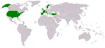 Currently, eight countries maintain consulates-general in Jerusalem: Belgium, France, Greece, Italy, Spain, Sweden, Turkey, and the United Kingdom. The Consulate General of the United States in Jerusalem was merged into the Embassy of the United States in 2018.[1] To this list, one usually includes the Vatican (Holy See), which maintains an "Apostolic Delegation to Jerusalem and Palestine" in Jerusalem.[2]