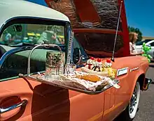 A drive-in restaurant is one where a customer can drive in with an automobile for service. For example, customers park their vehicles and are usually served by staff who walk out to take orders and return with food, encouraging diners to remain parked while they eat. Often, the restaurant staff attach a serving tray to a window of the vehicle.