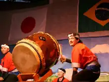 Several art performances are presented during the expo, with displays of modern and traditional dancing, ballet and singing from national and international artists.[49] Japanese drummers play at the outdoor theater and young Nisei dancers perform the devil's sword dance (鬼剣舞, onikenbai).[50][51] The manufacturing process of drums can be observed at the Yguazú Drum Workshop (イグアス太鼓工房, Iguasu taiko kōbō), the first of its kind in South America, which sells the drums and engraves people's names on them.[52]
