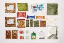 The United States Armed Forces' Meal, Ready-to-Eat (MRE) is packaged similarly to the Canadian ration. Each sealed plastic bag contains one entire precooked meal, with a number of supplements and accessories. The original 12 menus have been expanded to 24 and now contain a variety of ethnic and special request items as well. Kosher/Halal and Vegetarian menus are also provided. Each meal bag contains an 8-ounce (230 g) main course (packaged in a four-layer plastic and foil laminate retort pouch), 8 hardtack crackers, some form of spread (cheese, peanut butter, or jelly), a fruit-based beverage powder, some form of dessert (cake, candy, cookies, or fruit), and an accessory packet containing coffee or tea, creamer, sugar, salt, matches, a plastic spoon, and toilet paper. A chemical heater is packed with every meal.