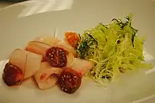 | Kuai | China | Finely cut strips of raw fish or meat, which was popular and commonly eaten in the early history and dynastic times of China. According to the Book of Rites compiled between 202 BCE–220 CE, kuai consists of small thin slices or strips of raw meat, which are prepared by first thinly slicing the meat and then cutting the thin slices into strips. In modern times, the dishes are more often referred to as "raw fish slices". Commonly used fish in ancient times include carp and mandarin fish, but salmon is also used in modern times. Sauces were an essential part of kuai dishes, with green onions used for preparation of sauces in spring and mustard seed used for sauces in autumn. According to many classical texts, kuai served without sauces was deemed inedible and should be avoided.[2] | |