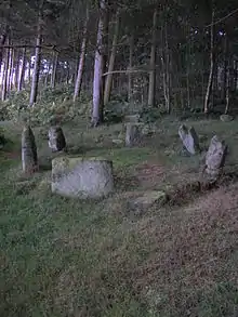 The Ōyu Stone Circles (大湯環状列石 Ōyu Kanjyō Resseki) is a late Jōmon period (approx. 2,000 – 1,500 BC) archaeological site in the city of Kazuno, Akita Prefecture, in the Tōhoku region of northern Japan. The site consists of two large stone circles located on an artificially flattened plateau on the left bank of the Oyu River, a tributary of the Yoneshiro River in northeastern Akita Prefecture. The site was discovered in 1931, with detailed archaeological excavations taking place in 1946, and in 1951–1952.