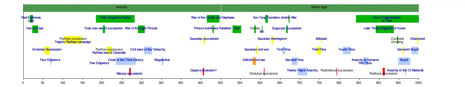 Note: Wars of succession in transcontinental states are mentioned under the continents where their capital city was located. Names of wars that have been given names by historians are capitalised; the others, whose existence has been proven but not yet given a specific name, are provisionally written in lowercase letters (except for the first word, geographical and personal names).