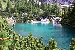 Little Lake Liqenat or Lake Drelaj (Albanian: Liqeni i Drelajve or Leqinati i vogël; Serbian: Језеро Мали Лићенат / Jezero Mali Lićenat) is a small lake found on Mount Leqinat that reaches an elevation of 2,341 m (7,680 ft) in the Accursed Mountains range in western Kosovo, near the border with Montenegro. The length of this lake is 100 m (328 ft) and the maximum width is 40 m (131 ft). Little Lake Liqenat at a lower elevation than the much larger Lake Liqenat found in the west of it and only a hill of pine trees separates the two.