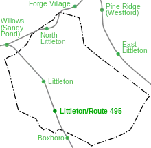 North Littleton station was located on the 1858-opened Stony Brook Railroad at Great Road (Route 119).[26] The station building was closed in 1914 and torn down in 1928.[27] It was served by all three daily round trips in 1917, but only a single westbound trip stopped by 1929, and it was no longer served by the 1940s.[28][29][30] While open, it had been a flag stop for local trains as well as the overnight State of Maine Express.[3]:249