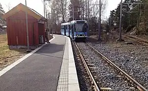 It was opened on 17 September 1941 as an extension of that line from Sæter. Until 1967, the stretch between Sæter and Ljabru was the only single track rail in Oslo.[1] A bridge that is located between Ljabru and Sæter was still single track until it was expanded in 2014. This was the last part of the tramway network to be upgraded to double track.