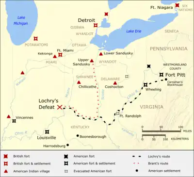 - ↑ For more background on the war in the West, see Western theater of the American Revolutionary War. A standard academic history of the Ohio River border war is Downes, Council Fires.