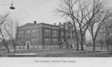 Soon after settlers arrived in 1830, school classes began in a log cabin on what is now Division Street. The first village school was built in 1857, and housed students of all ages. The three-story building was built of local dolomitic limestone, with a four-sided clock tower on its roof. The first graduation commencement was June 28, 1888 with seven graduates. A fire destroyed the school on August 10, 1895. Classes were held in churches and other buildings until a new structure was ready.