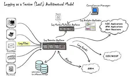 Logging as a service (LaaS) is an IT architectural model for centrally ingesting and collecting any type of log files coming from any given source or location such as servers, applications, devices etc. The files are "normalized" or filtered for reformatting and forwarding to other dependent systems to be processed as “native” data, which can then be managed, displayed and ultimately disposed of according to a predesignated retention schedule based on any number of criteria.