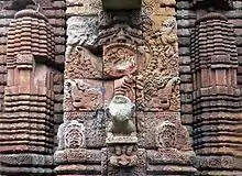 The upper jangha has pidha mundis in anuratha and kanika pagas. The niches within the mundis enshrine various Saivite divinities like Bhairavas, Ardhanarisvara, Mahisasuramardini, Lakulisa etc. along with carvings of naga-nagis, vyalas, nayikas, etc.