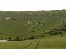 The Long Man of Wilmington or Wilmington Giant is a hill figure on the steep slopes of Windover Hill near Wilmington, East Sussex, England. It is 6 miles (9.7 km) northwest of Eastbourne and 13 mile (540 m) south of Wilmington. Locally, the figure was once often called the "Green Man".[1] The Long Man is 235 feet (72 m) tall,[2] holds two "staves", and is designed to look in proportion when viewed from below.