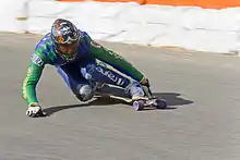 The ‘helmet culture’ is more prevalent in longboarding than in conventional skateboarding.[8] Most riders wear protective equipment in all disciplines, and nearly all professionals wear a helmet and gloves. Longboard protective equipment is similar to standard skateboard equipment, with the exception of slide gloves. Most longboarders wear slide gloves and helmets,[9] as these are considered the bare minimum for protection. Additional protection includes leathers, wrist guards, knee pads, elbow pads and sometimes spine protectors and padded shorts. Many professional longboarding teams and riders are required to wear and advocate all aspects of protection. In the sliding and downhill disciplines, riders wear "slide gloves" which are specialized gloves made out of strong materials such as leather and synthetic fabrics, and have large discs called "pucks" attached to the palms. These are attached to protect the hands as the rider uses them to pivot during slides along the ground. The pucks are usually made of synthetic polymers: delrin, UHMW, or corian.
