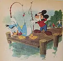 Lichtenstein made several alterations to the original work: he eliminated various figures and rotated the dock so that Donald looks off the side rather than the end. At the same time, he kept Donald and Mickey in almost the same positions as they were in the original.[21] Lichtenstein not only redesigned the space, but also altered the position of Donald's body and fishing rod and eliminated signs of stress and exertion.[22] He also adds a speech balloon, making Donald seem unaware that he has failed to cast his rod. Walt Disney said about Donald Duck: "He's got a big mouth, a big belligerent eye, a twistable neck and a substantial backside that's highly flexible. The duck comes near being the animator's ideal subject."[23] Lichtenstein's painting reflects many of these physical features.[24]