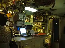 Two watertight compartments are used in the Los Angeles-class submarines. The forward compartment contains crew living spaces, weapons-handling spaces, and control spaces not critical to recovering propulsion. The aft compartment contains the bulk of the submarine's engineering systems, power generation turbines, and water-making equipment.[25] Some submarines in the class are capable of delivering Navy SEALs through either a SEAL Delivery Vehicle deployed from the Dry Deck Shelter or the Advanced SEAL Delivery System mounted on the dorsal side, although the latter was cancelled in 2006 and removed from service in 2009.[26] A variety of atmospheric control devices are used to allow the vessel to remain submerged for long periods of time without ventilating, including an electrolytic oxygen generator, which produces oxygen for the crew and hydrogen as a byproduct. The hydrogen is pumped overboard but there is always a risk of fire or explosion from this process.[1][27]