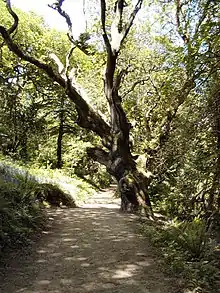 The northern part of the gardens, which includes the main ornamental and vegetable gardens, are slightly higher than the house and slope gently down to it. The areas of the gardens to the west, south, and east of the house slope steeply down into a series of valleys that ultimately drain into the sea at Mevagissey. These areas are much wilder and include the Jungle and the Lost Valley.[3]