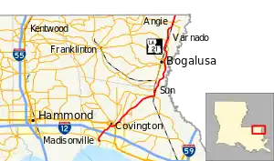 Through most of Covington, LA 21 is in a mostly two-lane undivided highway concurrent with US 190 Bus., which returns to US 190 on the east side of Covington—an area known as Claiborne Hill. After intersecting US 190 and before leaving Covington cosigned as Military Road, LA 21 absorbs LA 36 and continues northeastward, absorbing LA 59 and entering a brief concurrency with Louisiana Highway 40 in Bush for less than one mile (1.6 km). Between Bush and Sun, LA 21 widens to a four lane, divided highway after merging Louisiana Highway 41, continuing due north from the merge. In Sun LA 21 absorbs LA 16 and continues northward to Bogalusa, where LA 21 intersects LA 10. LA 21 then runs north through Varnado and Angie before becoming Mississippi Highway 35 at the state line.[1]