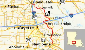 Louisiana Highway 31 (LA 31) is a 54.6-mile-long (87.9 km) north–south state highway in Louisiana that serves Iberia, St. Martin, and St. Landry parishes, extending from LA 182 in New Iberia, and ending at the same highway in Opelousas.[2]