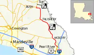 Louisiana Highway 41 (LA 41) is a state highway located in St. Tammany Parish, Louisiana. It runs 23.07 miles (37.13 km) in a north–south direction from the junction of U.S. Highway 11 (US 11) and LA 3081 in Pearl River to LA 21 in Bush.