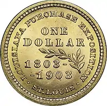 The Louisiana Purchase Exposition gold dollar is a commemorative coin issue dated 1903. Struck in two varieties, the coins were designed by United States Bureau of the Mint Chief Engraver Charles E. Barber. The pieces were issued to commemorate the Louisiana Purchase Exposition held in 1904 in St. Louis; one variety depicted former president Thomas Jefferson, and the other, the recently assassinated president William McKinley. Although not the first American commemorative coins, they were the first in gold.