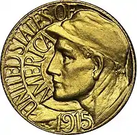 Anthony Swiatek and Walter Breen, in their encyclopedia of commemorative coins, suggested that the decision to have multiple designs was "through some unrecorded agreement".[3] The legislation was ambiguous enough to permit such an interpretation, and numismatist Farran Zerbe urged the Mint to strike more than one type of coin, stating that sales would be increased if this was done.[5] Zerbe was not only a collector (he would serve as president of the American Numismatic Association from 1908 to 1910), but he also promoted numismatics with his traveling exhibition, "Money of the World". He was involved in the distribution of commemorative coins from the Columbian half dollar of 1892 to the Panama-Pacific issue of 1915, and would be the sole distributor of Louisiana Purchase dollars.[6][7]