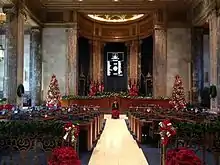 By November 1930, the designs for the building were finalized, and, on December 16, construction of the capitol was started.[24] A spur from the nearby Yazoo and Mississippi Valley Railroad to the capitol was also built "to facilitate the delivery of the 2,500 carloads of necessary materials".[24] Work on the building progressed rapidly due to the insistence by Long that it be completed under his governorship.[25] Long, who had been elected to the United States Senate in 1930, delayed taking the oath of office until January 1932 to prevent a political adversary, Paul N. Cyr, from becoming governor. Despite being completed in little over a year, the State Capitol was not dedicated until May 16, 1932, during the inauguration of Governor Oscar K. Allen.[25][26]