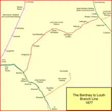 The Louth to Bardney Line was an English railway line built by the Louth and Lincoln Railway Company, in Lincolnshire, England. It opened in stages between 1874 and 1876, after serious difficulties in raising subscription capital, and following alteration to the planned route. It was hoped to serve large reserves of ironstone along its route, but the deposits were not as large as hoped, and the line was never financially successful.